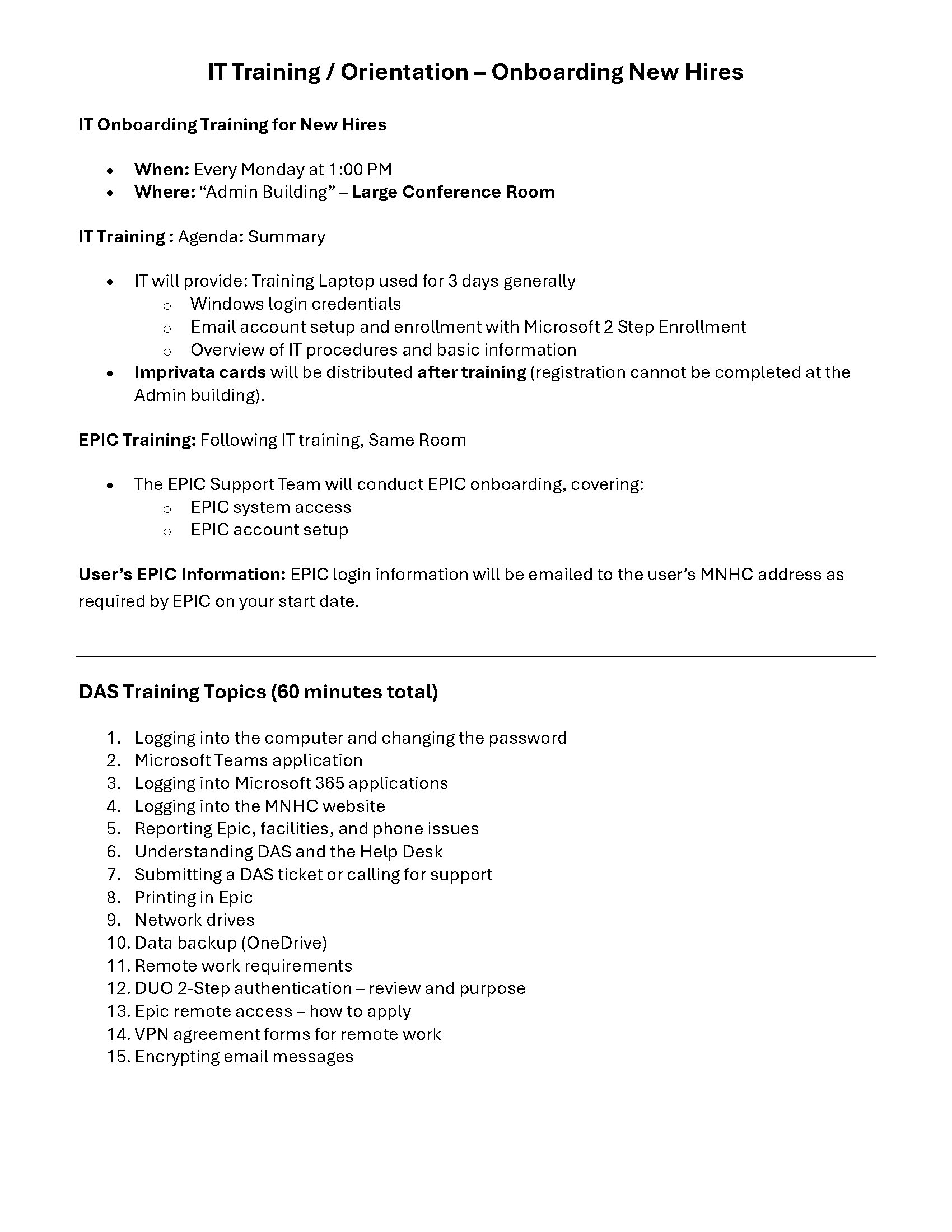 IT Training / Orientation Schedule