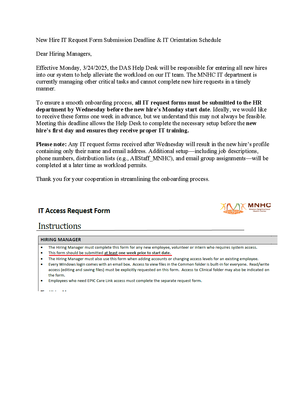 Hiring Managers Information on New Hires & Training Schedule